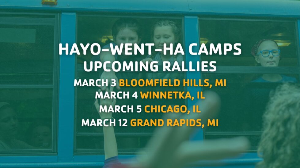 UPDATE: Rally added in Traverse City on March 17! Hayo-Went-Ha Camps are on tour! Find us in Bloomfield Hills, Winnetka, Chicago, and Grand Rapids in March! Join us for pizza and pop. We’ll give a short presentation on camp and have plenty of space for questions and conversation. Bloomfield Hills on March 3, 6:30 pmBloomfield Township Public Library1099 Lone Pine …